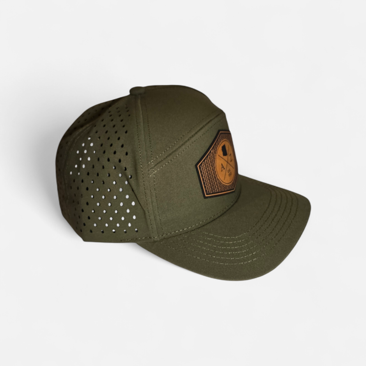 This is a army green 6 panel performance fabric hat that has a flat front with snapback closure. The patch has a cactus print with a focus on the state of Arizonas founding.