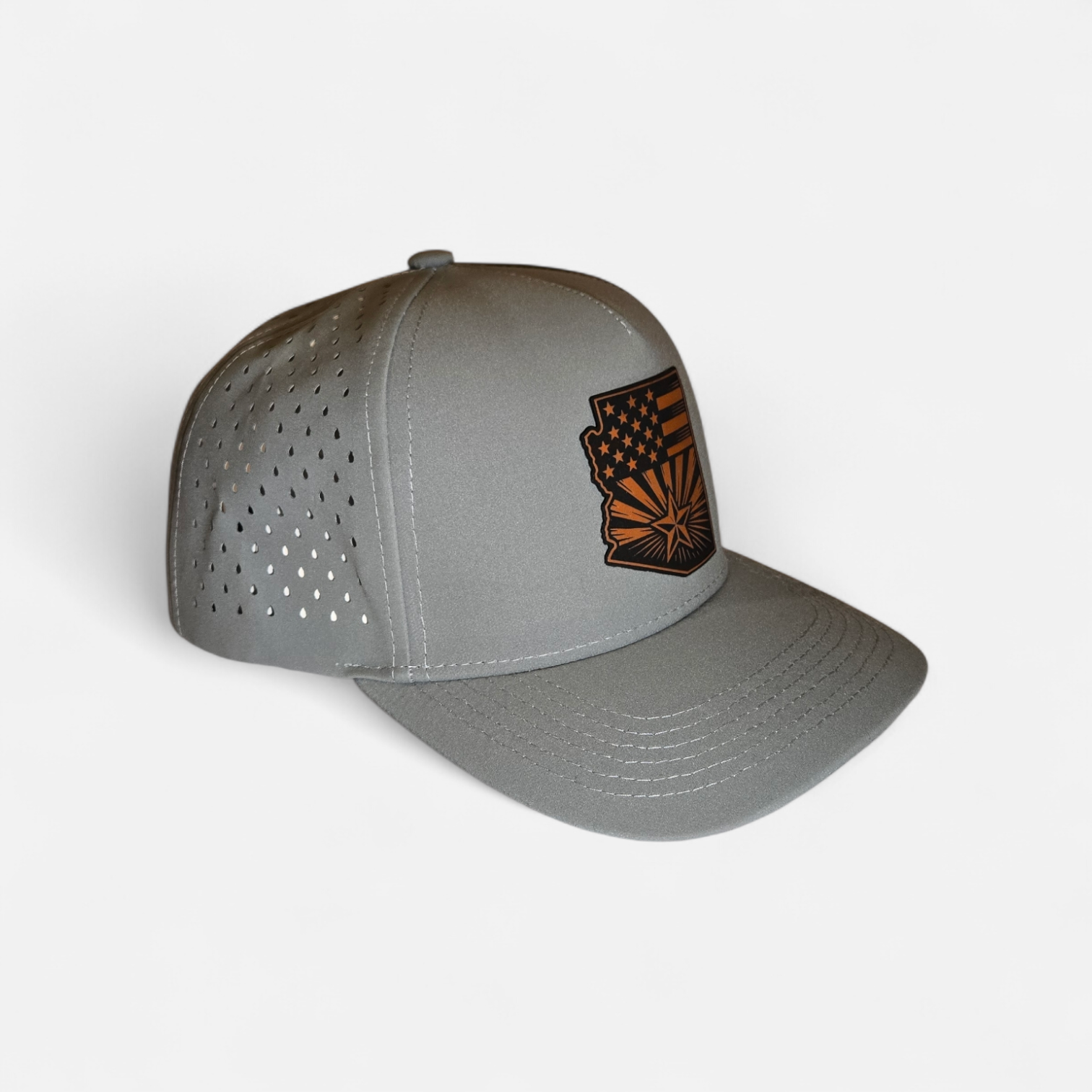 This hat shows off the people of Arizonas pride in both their state and their country. The rawhide patch is placed on a gray 5 panel performance hat with laser cut holes and a snapback clasp on the back.