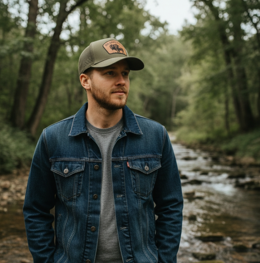 This is a army green 5 panel performance hat with a snapback closure. It has a Big Bison Hat Co branded patch with a bison on it.