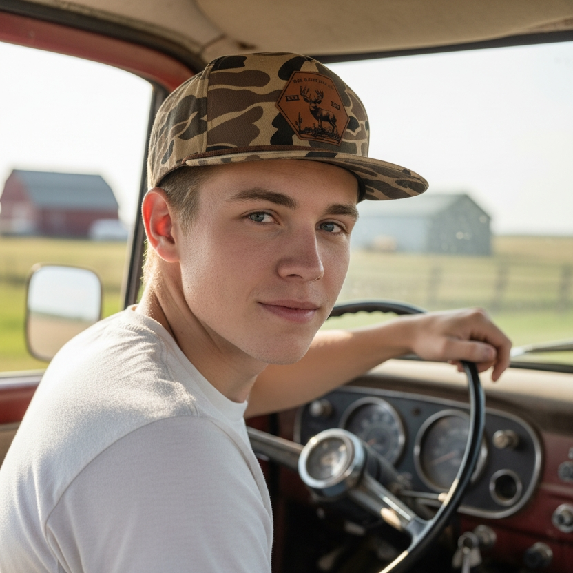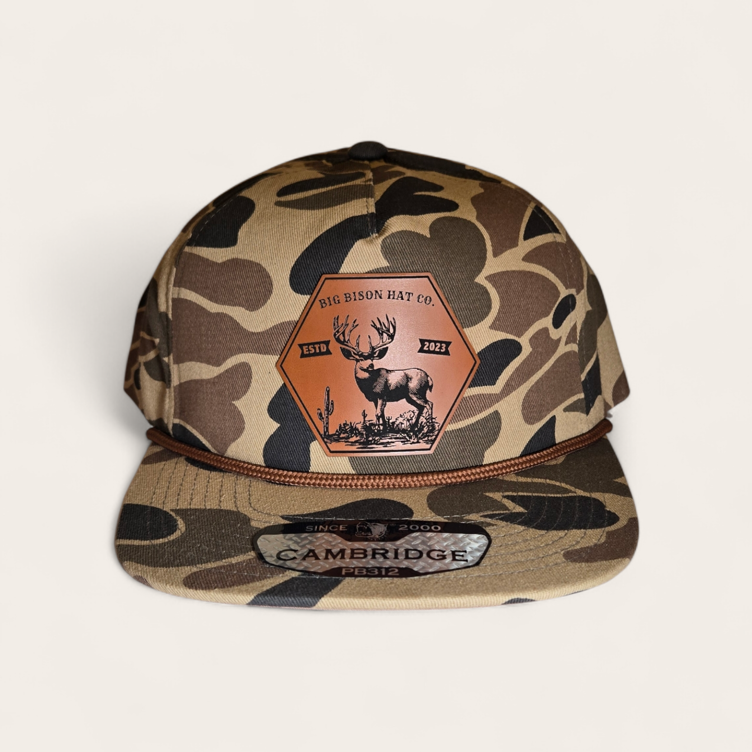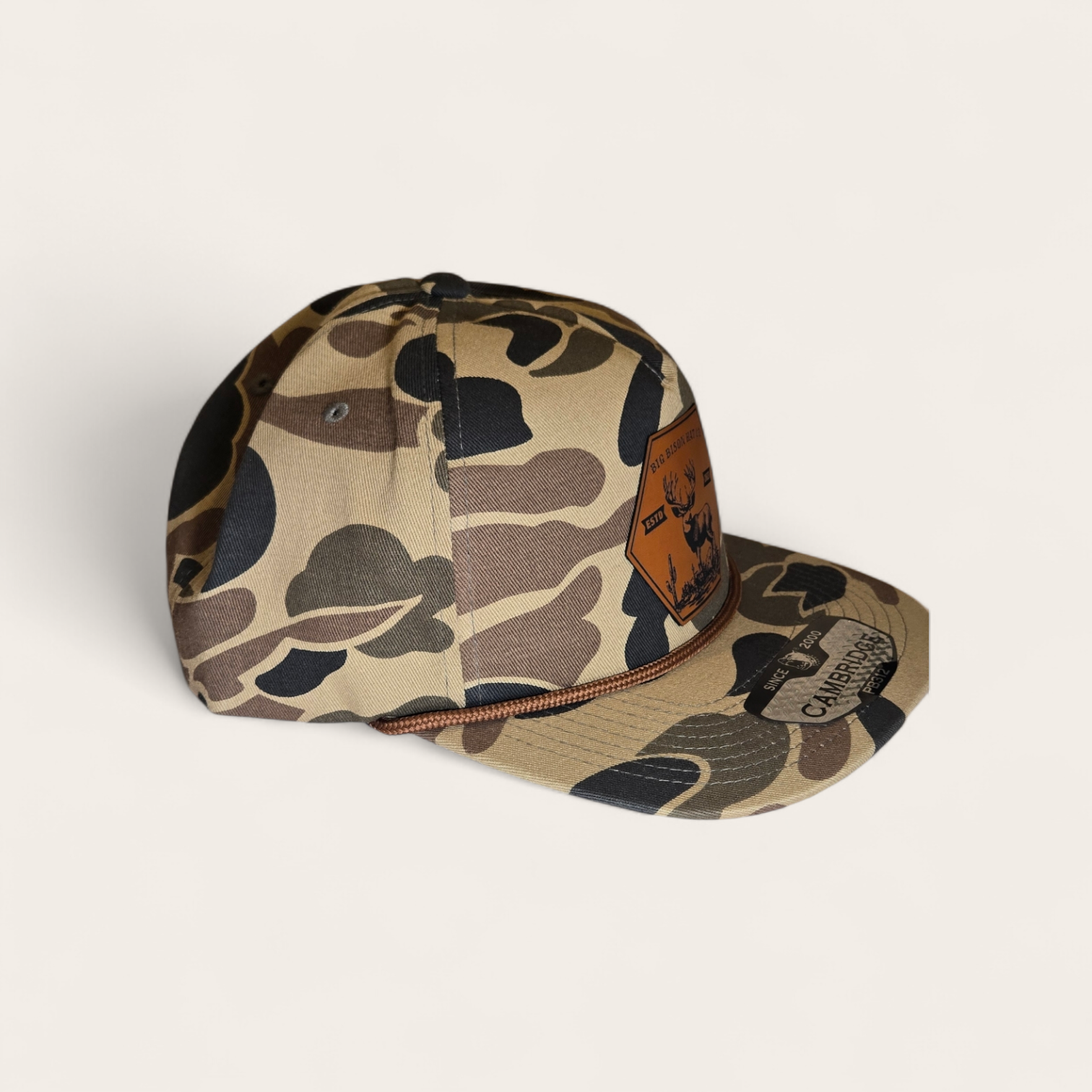 This hat has straight-up backcountry energy. Classic camo 5 panel rope hat with a hexagon patch that has a monster buck we all dream of seeing while on the hunt.