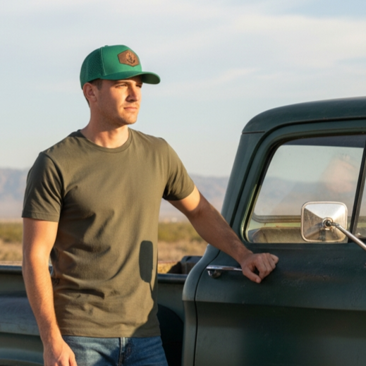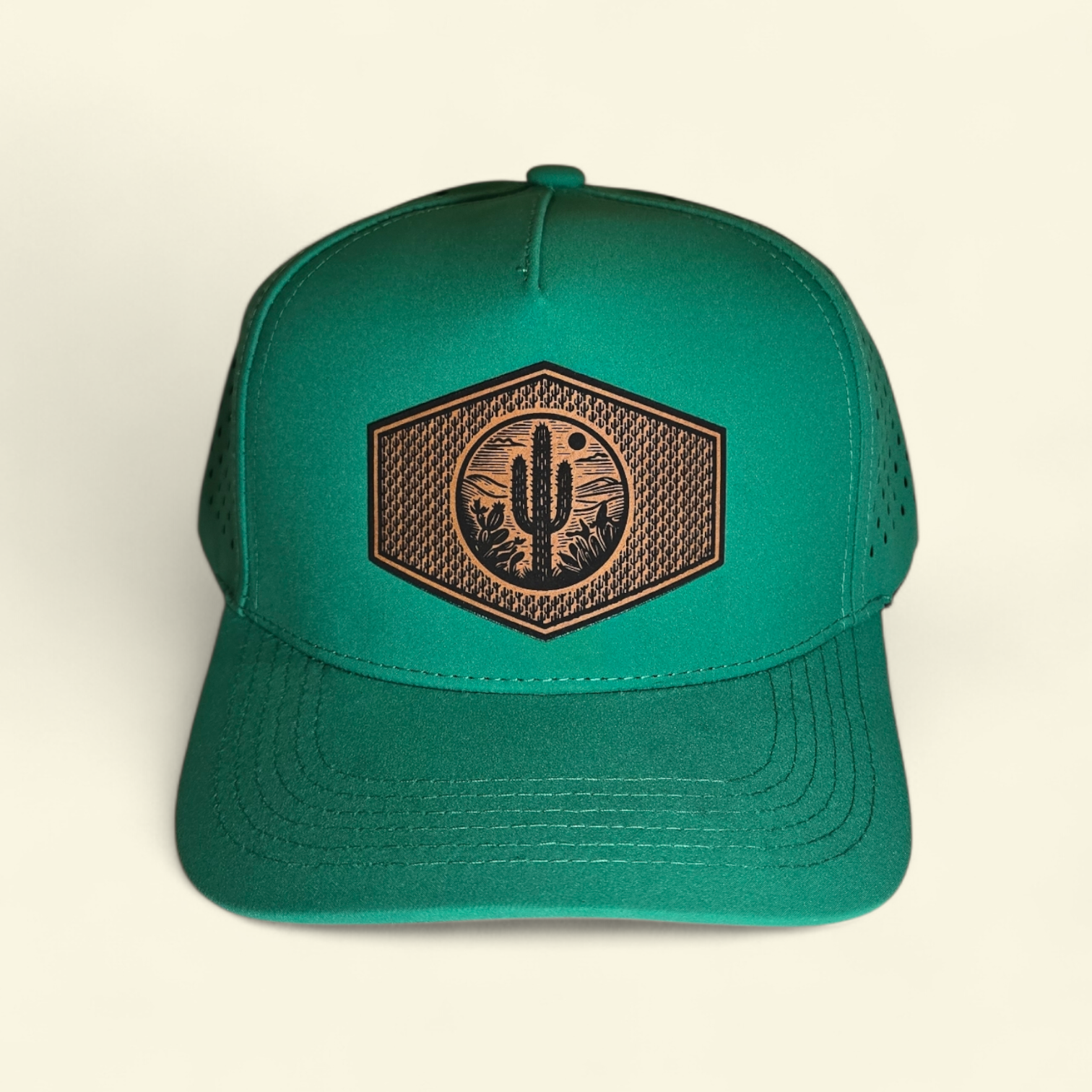 This green 5 panel performance hat highlights the desert and cactus. The hat has performance fabric, lazer cut holes, and a snapback clasp on the back.