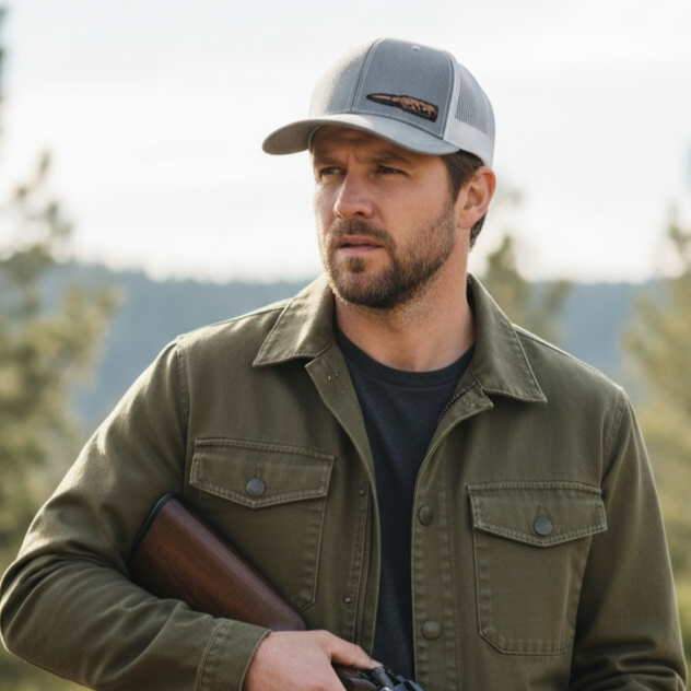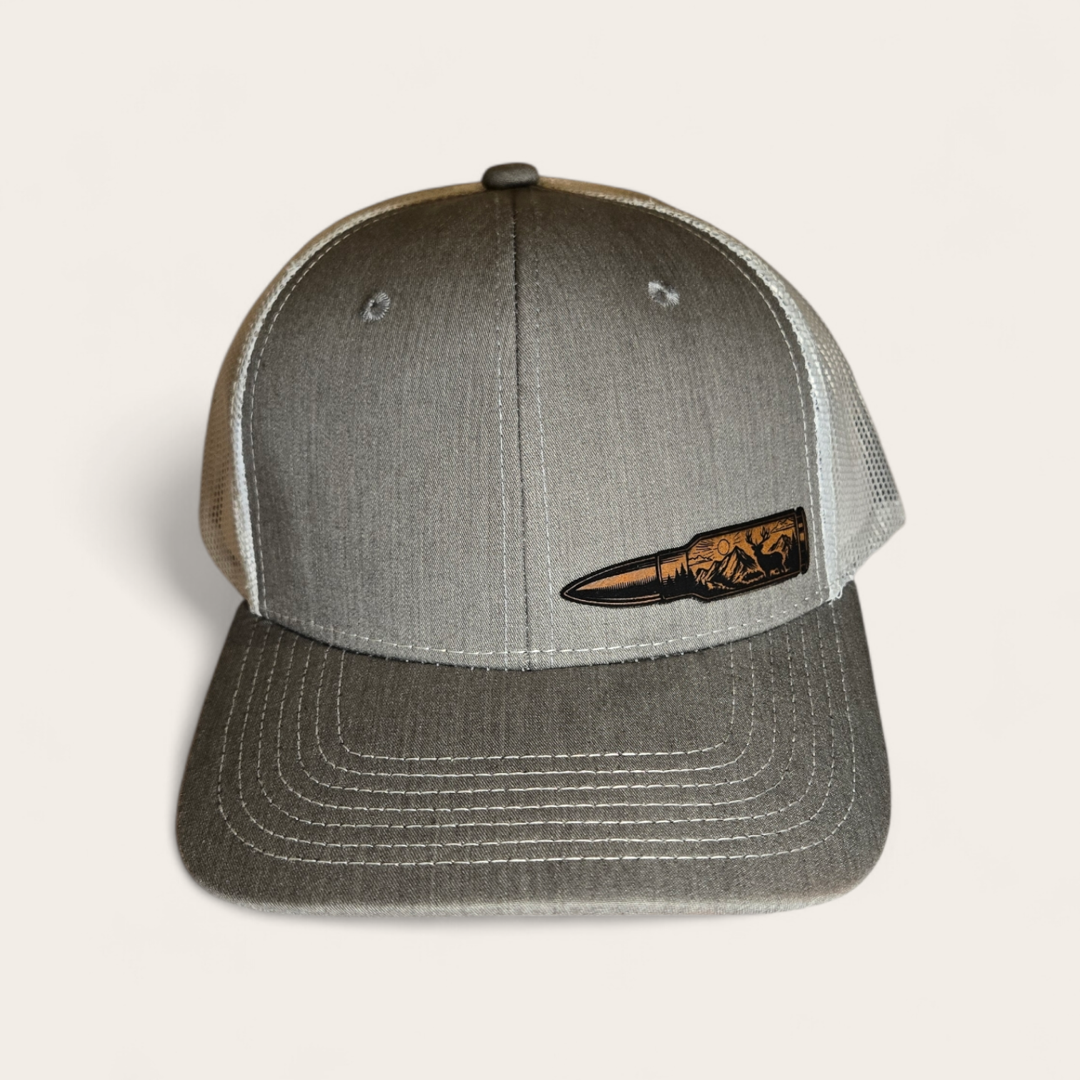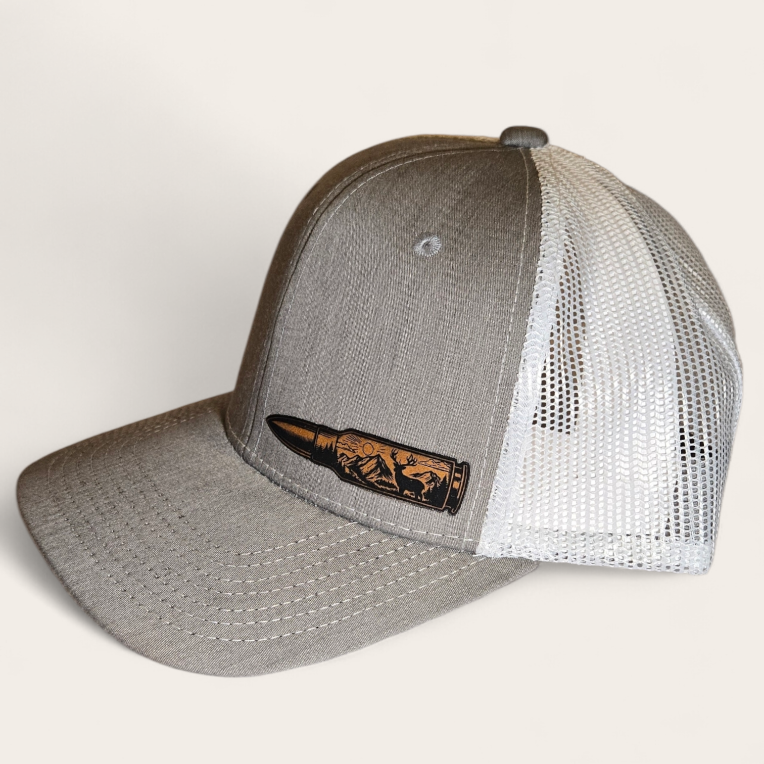 This is a heather gray/white mesh trucker hat with a bullet shaped patch on the side panel with mountains and a buck in the patch.