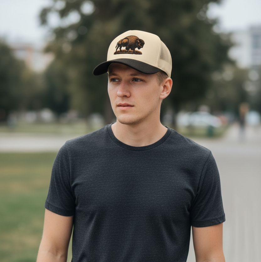 This is a cream performance 5 panel hat with a black brim and a snapback closure. This hat has a traditional die cut bison on the front of the hat.
